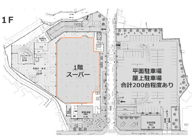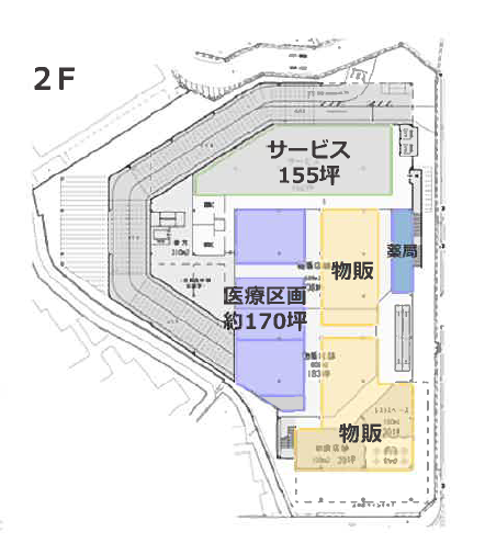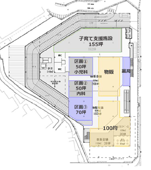 1階はスーパー、2階は物販と医療モールからなり、医療モールは既に内科、小児科が決定済。