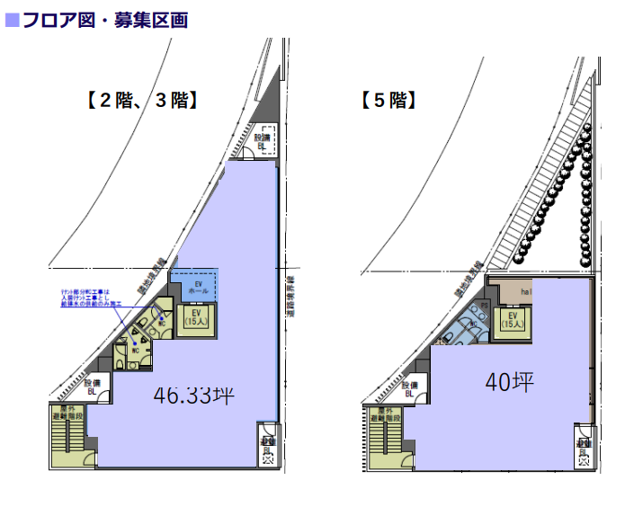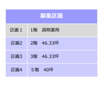 | 面積 | 2階46.33坪、3階46.33坪、5階40坪 |