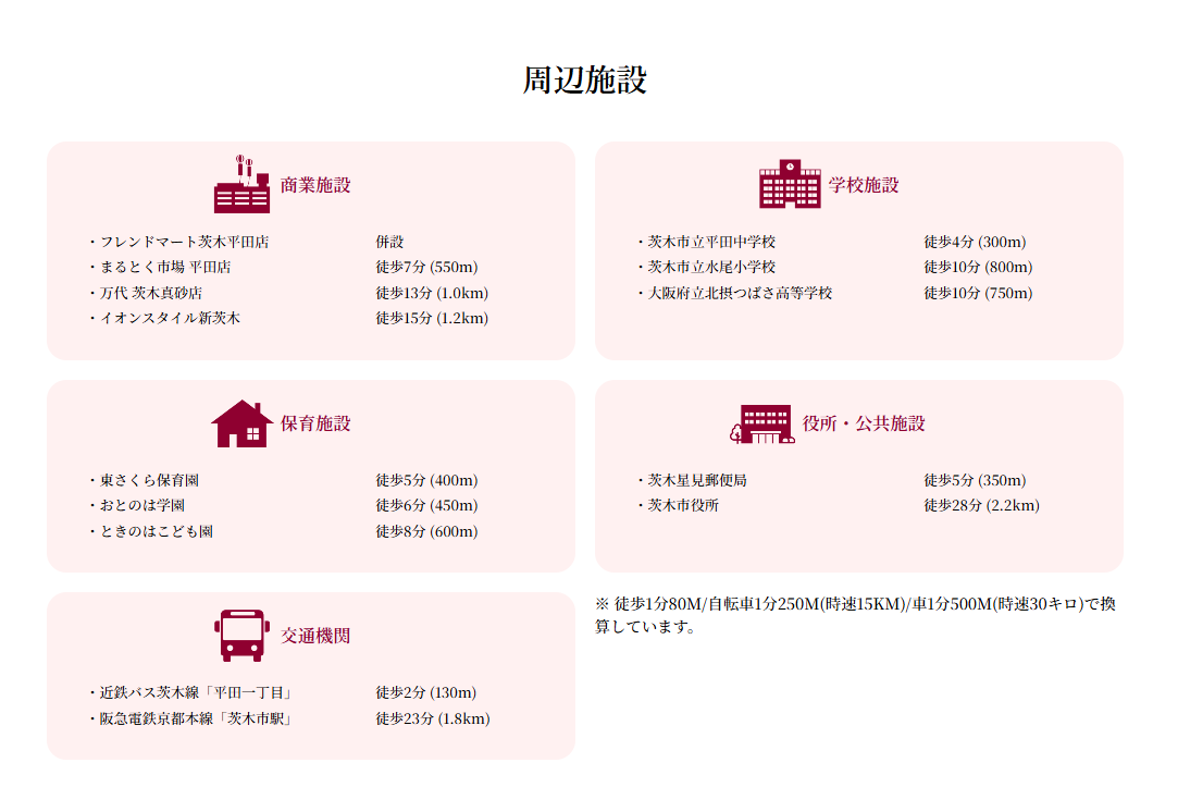 アクセス面でも、近鉄バス茨木線「平田一丁目」や阪急電鉄京都本線の茨木市駅が近く、公共交通機関を利用する方々にも非常に便利な立地です。