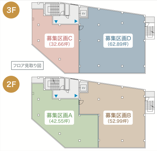 | 面積 | 2階A区画:140.69㎡(42.55坪) 2階B区画:175.20㎡(52.99坪) 3階C区画:107.97㎡(32.66坪) 3階D区画:207.92㎡(62.89坪) |