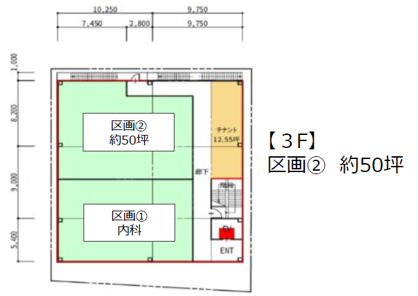 1,2階がドラッグストアで、3階に2区画(各50坪)があり、1区画には内科医院が開業済です。