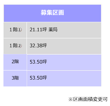 | 面積 | 区画①32.38坪、区画②53.50坪、区画③53.50坪 ※区画面積調整可 |