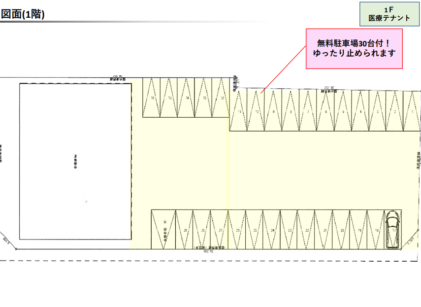 駐車場30台付きの1階テナントが魅力です。