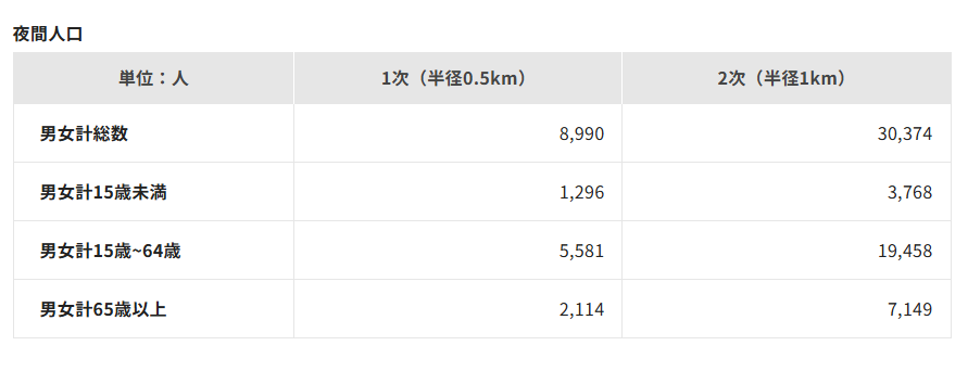 - 1キロ圏内30,000人、2キロ圏内128,000人を超えてくる人口密度が高いエリアです。