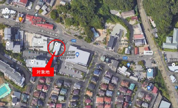 有馬街道から鈴蘭台駅へ抜ける県道197号を曲がったところにある「ウエルシア神戸鈴蘭台北町店」に隣接する戸建てテナントです。