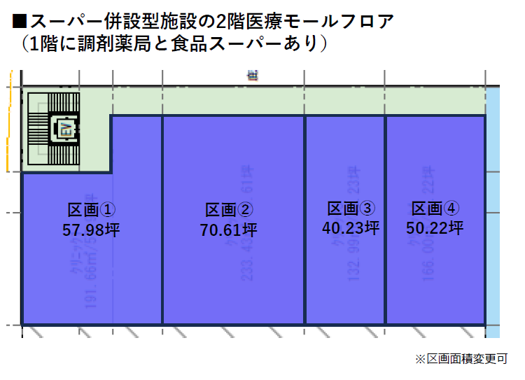 1階には調剤薬局と食品スーパーがあり、2階に医療フロアが計画されています。