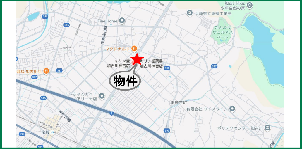 兵庫県加古川市東神吉町の県道43号線沿いのドラッグストア隣地に、戸建てクリニック建て貸し案件です。